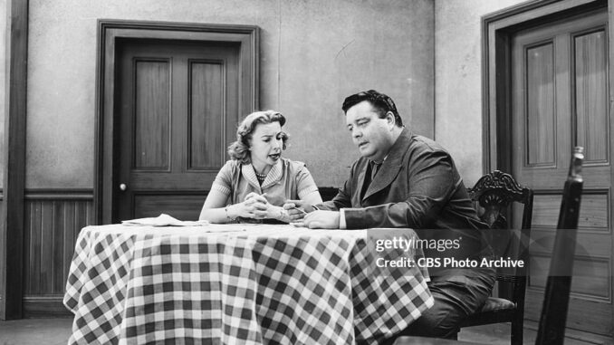 NEW YORK - AUGUST 23: Jackie Gleason as Ralph Kramden and Audrey Meadows as Alice Kramden in THE HONEYMOONERS. Image dated August 23, 1955. (Photo by CBS via Getty Images)