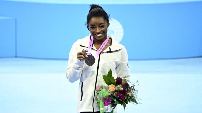 Simone Biles has medals that glitter under stadium lights. But her newest achievement shines in a quieter way.