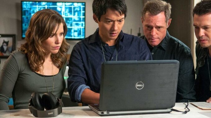 Erin Lindsay (Sophia Bush), Sheldon Jin (Archie Kao), Hank Voight (Jason Beghe), and Antonio Dawson (Jon Seda) appear in a scene from Chicago P.D.