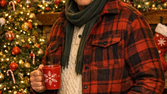 In the festive snapshot, the Hollywood icon appears relaxed and cheerful, standing in front of a beautifully decorated Christmas tree and a glowing fireplace. Dressed in a red plaid jacket layered over a cream knit sweater, paired with a classic cowboy hat and scarf, Costner holds a red mug adorned with a snowflake design — radiating rustic holiday charm.