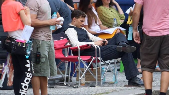 Shot from a distance and lacking any official confirmation, they appear to capture a figure resembling Dornan dressed in what could be period or fantasy-style costume, surrounded by a production crew in what looks like an outdoor set. There are no logos, no verified sources—just enough detail to make people wonder, and just enough ambiguity to keep the debate alive.