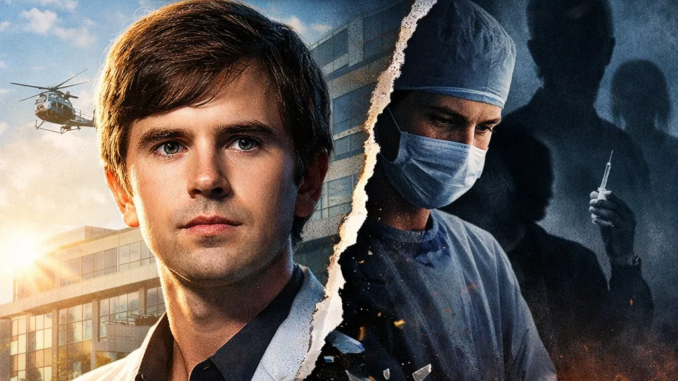 Front and center stands Shaun Murphy, calm yet intense, symbolizing the heart of the series. But the image is dramatically split in two — and that’s where things take a dark turn.