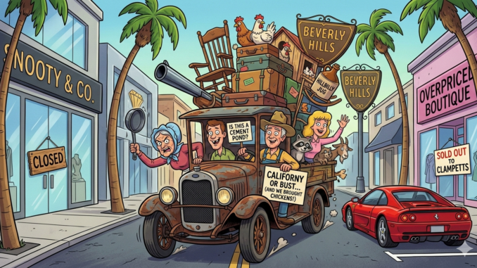 The premise is a masterpiece of simplicity: Jed Clampett strikes oil, becomes a billionaire overnight, and moves his entire backwoods family to the snobbiest neighborhood on Earth—Beverly Hills.