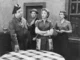 Jackie Gleason, Art Carney, Joyce Randoph and Audrey Meadows stand by a banner announcing a raffle for a new TV on the set of 'The Honeymooners'